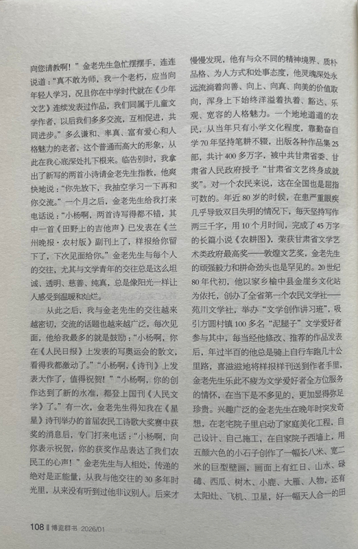 從此之后,我與金老先生的交往越來(lái)越密切,交流的話題也越來(lái)越廣泛,每次見面,他給我最多的就是鼓勵(lì):“小楊啊,你在《人民日?qǐng)?bào)》上發(fā)表的寫奧運(yùn)會(huì)的散文,看得我都激動(dòng)了。”“小楊啊,《詩(shī)刊》上發(fā)表大作了,值得祝賀!”“小楊啊,你的創(chuàng)作達(dá)到了新的水準(zhǔn),都登上國(guó)刊《人民文學(xué)》了。”有一次,金老先生得知我在《星星》詩(shī)刊舉辦的首屆農(nóng)民工詩(shī)歌大獎(jiǎng)賽中獲獎(jiǎng)的消息后,專門打來(lái)電話:“小楊啊,向你表示祝賀,你的獲獎(jiǎng)作品表達(dá)了我們農(nóng)民工的心聲!”金老先生與人相處,傳遞的絕對(duì)是正能量,從我與他交往的30多年時(shí)光里,從來(lái)沒有聽到過(guò)他非議別人。后來(lái)才慢慢發(fā)現(xiàn),他有與眾不同的精神境界、質(zhì)樸品格、為人方式和處事態(tài)度,他靈魂深處永遠(yuǎn)流淌著向善、向上、向真、向美的價(jià)值取向,渾身上下始終洋溢著執(zhí)著、豁達(dá)、樂(lè)觀、寬容的人格魅力。一個(gè)地地道道的農(nóng)民,從當(dāng)年只有小學(xué)文化程度,靠勤奮自學(xué)70年堅(jiān)持筆耕不輟,出版各種作品集25部,共計(jì)400多萬(wàn)字,被中共甘肅省委、甘肅省人民政府授予“甘肅省文藝終身成就獎(jiǎng)”。對(duì)一個(gè)農(nóng)民來(lái)說(shuō),這在全國(guó)也是屈指可數(shù)的。年近80歲的時(shí)候,在患嚴(yán)重眼疾幾乎導(dǎo)致雙目失明的情況下,每天堅(jiān)持寫作兩三千字,用10個(gè)月時(shí)間,完成了45萬(wàn)字的長(zhǎng)篇小說(shuō)《農(nóng)耕圖》,榮獲甘肅省文學(xué)藝術(shù)類政府最高獎(jiǎng)——敦煌文藝獎(jiǎng),金老先生的頑強(qiáng)毅力和拼命勁頭也是罕見的。20世紀(jì)80年代初,他以家鄉(xiāng)榆中縣金崖鄉(xiāng)文化站為依托,創(chuàng)辦了全省第一個(gè)農(nóng)民文學(xué)社——苑川文學(xué)社,舉辦“文學(xué)創(chuàng)作講習(xí)班”,吸引方圓村鎮(zhèn)100多名“泥腿子”文學(xué)愛好者參與其中,每當(dāng)經(jīng)他修改、推薦的作品發(fā)表后,年過(guò)半百的他總是騎上自行車跑幾十公里路,喜滋滋地將樣報(bào)樣刊送到作者手里,金老先生樂(lè)此不疲為文學(xué)愛好者全方位服務(wù)的情懷,在當(dāng)下是不多見的,更加顯得彌足珍貴。興趣廣泛的金老先生在晚年時(shí)突發(fā)奇想,在老宅院子里啟動(dòng)了家庭美化工程,自己設(shè)計(jì)、自己施工,在自家院子西墻上,用五顏六色的小石子創(chuàng)作了一幅長(zhǎng)八米、寬二米的巨型壁畫,畫面上有紅日、山水、碌碡、西瓜、樹木、小鹿、大雁、人物,還有太陽(yáng)灶、飛機(jī)、衛(wèi)星,好一幅天人合一的田園風(fēng)光畫。站在壁畫面前,讓人遐想萬(wàn)千、拍手叫絕,這一獨(dú)具特色的創(chuàng)舉,完全表達(dá)了金老先生所渴望的理想王國(guó)和精神家園。2014年4月,金老先生家庭被國(guó)家廣播電視總局授予首屆全國(guó)“書香之家”稱號(hào)。進(jìn)入耄耋之年的金老先生,創(chuàng)作激情依然旺盛,他又癡迷于劇本創(chuàng)作,先后創(chuàng)編了大型劇目4部,小戲小品曲藝46個(gè)。他不僅要?jiǎng)?chuàng)作劇本,而且還要想方設(shè)法搬上舞臺(tái)。為此他東奔西跑,甚至還要自掏腰包,千方百計(jì)尋找業(yè)余劇團(tuán),想盡辦法爭(zhēng)取高水平、低成本演出。雁過(guò)留聲,腳踏留痕,鄉(xiāng)村廣場(chǎng)、學(xué)校操場(chǎng)、打麥場(chǎng)上都留下了他帶隊(duì)演出的閃光足跡和百姓的歡歌笑語(yǔ)。興致高時(shí),金老先生還上臺(tái)扮演一個(gè)角色,過(guò)足他愛戲唱戲的癮,完全和大家心連心、共歡樂(lè)。晚年的他最喜歡表演自編自導(dǎo)的古劇種“扁擔(dān)戲”,除了在村上幼兒園演出外,大多在自家的院子里演出,有時(shí)觀眾只有他老伴和孫女,還有一條忠實(shí)的小狗。金老先生用這種獨(dú)特的方式,表達(dá)對(duì)民族優(yōu)秀傳統(tǒng)文化的敬畏和弘揚(yáng),也讓我們感受到一位真正熱愛生活的作家,一定是牢牢生根在生他養(yǎng)他的這片土地上。2018年2月,他破例給子女們提出了一個(gè)心愿,在3月25日他85歲生日時(shí),舉辦一場(chǎng)小型的家庭音樂(lè)會(huì)。于是金老先生請(qǐng)來(lái)了業(yè)余樂(lè)隊(duì)和歌唱演員,用合唱、歌伴舞等形式演出了由金老先生作詞的歌曲。金老先生身著紅色的盛裝,親自登臺(tái)演唱了由他改編的民歌《繡荷包》。他為家庭音樂(lè)會(huì)演出臺(tái)上撰寫的對(duì)聯(lián)是:音樂(lè)陶冶性情管弦悠揚(yáng)動(dòng)四方,歌曲傳遞精神國(guó)歌隆重傳海外。兩個(gè)月后,金老先生安然去世,這場(chǎng)家庭音樂(lè)會(huì)竟成為他生命中的絕唱。金老先生就是這樣一位具有獨(dú)特人生信念、抱有獨(dú)特處世態(tài)度、富有獨(dú)特生活情趣、擁有獨(dú)特明亮童心的農(nóng)民作家,他身上始終散發(fā)著許多奇思妙想、創(chuàng)新火花和智慧光亮,讓人充滿無(wú)窮的敬意、敬畏和敬佩,我甚至認(rèn)為金老先生就是一位傳奇之人。