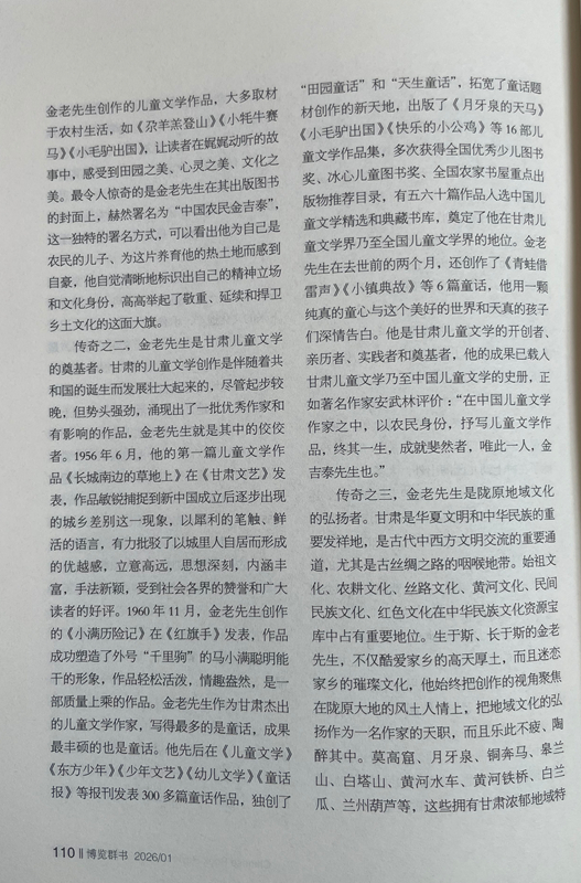 傳奇之二,金老先生是甘肅兒童文學(xué)的奠基者。甘肅的兒童文學(xué)創(chuàng)作是伴隨著共和國(guó)的誕生而發(fā)展壯大起來(lái)的,盡管起步較晚,但勢(shì)頭強(qiáng)勁,涌現(xiàn)出了一批優(yōu)秀作家和有影響的作品,金老先生就是其中的佼佼者。1956年6月,他的第一篇兒童文學(xué)作品《長(zhǎng)城南邊的草地上》在《甘肅文藝》發(fā)表,作品敏銳捕捉到新中國(guó)成立后逐步出現(xiàn)的城鄉(xiāng)差別這一現(xiàn)象,以犀利的筆觸、鮮活的語(yǔ)言,有力批駁了以城里人自居而形成的優(yōu)越感,立意高遠(yuǎn),思想深刻,內(nèi)涵豐富,手法新穎,受到社會(huì)各界的贊譽(yù)和廣大讀者的好評(píng)。1960年11月,金老先生創(chuàng)作的《小滿歷險(xiǎn)記》在《紅旗手》發(fā)表,作品成功塑造了外號(hào)“千里駒”的馬小滿聰明能干的形象,作品輕松活潑,情趣盎然,是一部質(zhì)量上乘的作品。金老先生作為甘肅杰出的兒童文學(xué)作家,寫得最多的是童話,成果最豐碩的也是童話。他先后在《兒童文學(xué)》《東方少年》《少年文藝》《幼兒文學(xué)》《童話報(bào)》等報(bào)刊發(fā)表300多篇童話作品,獨(dú)創(chuàng)了“田園童話”和“天生童話”,拓寬了童話題材創(chuàng)作的新天地,出版了《月牙泉的天馬》《小毛驢出國(guó)》《快樂(lè)的小公雞》等16部?jī)和膶W(xué)作品集,多次獲得全國(guó)優(yōu)秀少兒圖書獎(jiǎng)、冰心兒童圖書獎(jiǎng)、全國(guó)農(nóng)家書屋重點(diǎn)出版物推薦目錄,有五六十篇作品入選中國(guó)兒童文學(xué)精選和典藏書庫(kù),奠定了他在甘肅兒童文學(xué)界乃至全國(guó)兒童文學(xué)界的地位。金老先生在去世前的兩個(gè)月,還創(chuàng)作了《青蛙借雷聲》《小鎮(zhèn)典故》等6篇童話,他用一顆純真的童心與這個(gè)美好的世界和天真的孩子們深情告白。他是甘肅兒童文學(xué)的開創(chuàng)者、親歷者、實(shí)踐者和奠基者,他的成果已載入甘肅兒童文學(xué)乃至中國(guó)兒童文學(xué)的史冊(cè),正如著名作家安武林評(píng)價(jià):“在中國(guó)兒童文學(xué)作家之中,以農(nóng)民身份,抒寫兒童文學(xué)作品,終其一生,成就斐然者,唯此一人,金吉泰先生也。”