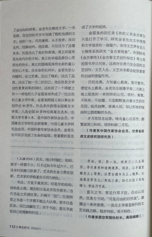 金雷泉的回憶錄《我的父親金吉泰》,只是打開了學(xué)習(xí)、研究金老先生文學(xué)理想和文學(xué)追求的一扇窗戶,有待文藝界有志人士繼續(xù)系統(tǒng)研究“金吉泰現(xiàn)象”。我期盼有《金吉泰傳》《金吉泰文藝創(chuàng)作探究》等之類的圖書早日問(wèn)世,這將對(duì)甘肅乃至全國(guó)的文藝創(chuàng)作、文藝人生、文藝未來(lái)都會(huì)起到重要的啟迪和借鑒作用。