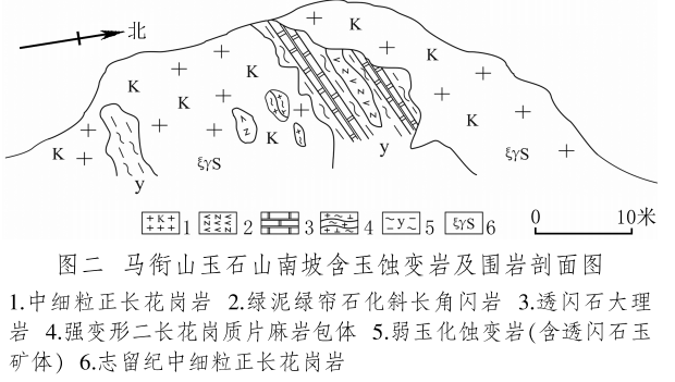 馬銜山玉礦分布在馬銜山東南部的玉石山(圖版一),海拔3028米。山上出露的地質(zhì)體主要為古元古界馬銜山巖群、中元古代片麻二長花崗質(zhì)巖[3]和志留紀(jì)正長花崗巖及正長巖。馬銜山巖群的巖性為黑云斜長片麻巖、變粒巖、斜長角閃巖和白云質(zhì)大理巖,巖石普遍遭受了韌性變形,變余糜稜?zhēng)r發(fā)育。志留紀(jì)巖漿侵入期后熱液活動(dòng)較強(qiáng),石英脈細(xì)脈發(fā)育,局部見螢石礦化或礦床[4]。玉礦化主要產(chǎn)于馬銜山巖群與志留紀(jì)正長花崗巖和正長巖接觸帶上(圖版二),具體賦存在與白云質(zhì)大理巖的接觸部位,是正長花崗巖及正長巖與鎂質(zhì)大理巖接觸交代蝕變的產(chǎn)物[5]?;◢弾r與片麻巖、變粒巖和斜長角閃巖接觸界線附近巖石雖有蝕變,但不見玉化蝕變巖或玉石出露。在近山頂開采玉石揭露的一個(gè)地質(zhì)剖面清晰地顯示了這些特征(圖二)。該剖面大致呈東西走向,長約50米,馬銜山巖群多呈殘留體出露,斜長角閃巖綠泥綠簾石化強(qiáng)烈,大理巖普遍發(fā)生蝕變,形成透輝透閃石大理巖,緊靠花崗巖接觸地帶發(fā)育窄窄的透閃石玉礦帶。現(xiàn)在人們找玉,也主要在該剖面上的花崗巖和鎂質(zhì)大理巖的接觸帶上鑿洞,在接觸帶上見有多處采挖玉石的洞穴。在該剖面西側(cè)約50米,發(fā)育有正長巖與大理巖的混染帶,肉紅色正長巖中包裹混染著大量灰綠色透閃透輝大理巖,部分已蝕變?yōu)橥搁W透輝石巖,且質(zhì)地較細(xì)膩,成為半玉化巖石。剖面和周圍地質(zhì)特征表明,玉礦的形成是早古生代志留紀(jì)花崗質(zhì)雜巖體侵入到古元古代鎂質(zhì)大理巖,發(fā)生接觸交代蝕變作用的結(jié)果,在兩種巖石接觸帶形成玉礦體。但并不是蝕變帶中的巖石都是透閃石玉石,透閃石玉在蝕變帶中多呈雞窩狀或不規(guī)則狀分布,少量呈脈狀出露。從剖面及部分采坑的規(guī)模來看,玉礦體向深處有變大、變好的趨勢(shì),這主要受控于接觸面產(chǎn)狀,在傾角較緩處礦體相對(duì)較大。橫向上在背離接觸面方向圍巖具有從透閃石玉到透閃透輝石玉、透閃透輝石大理巖再到含透閃石大理巖的變化特征,反映了交代蝕變強(qiáng)度與接觸帶溫度及熱液成分變化的密切關(guān)系。從玉礦體到蝕變圍巖由于成分和結(jié)構(gòu)的變化出現(xiàn)一系列不同類型的玉石或巖石。我們?cè)谄拭嫔喜杉揭恍┬K的淡綠色玉料(圖版三)和出露較寬的微晶大理巖,經(jīng)偏光顯微鏡下薄片鑒定和XRF檢測(cè),確定有透閃石玉、透輝透閃玉、透閃透輝石玉、透閃透輝石大理巖和含透閃石大理巖等,這與馬家窯遺址出土的齊家文化時(shí)期大部分玉質(zhì)品玉料類型基本一致[6]。部分地段近礦圍巖還有透輝石巖、透輝矽卡巖、矽卡巖化大理巖、蛇紋石化大理巖、斜長透輝石巖等。玉石山的采洞(坑)由于資源與環(huán)境保護(hù)的要求,大多已被填埋,但仍可見采坑殘留的位置。采洞(坑)均位于大理巖與正長花崗巖接觸帶靠近大理巖一側(cè),這也間接顯示了玉礦體的位置。此外,玉石山花崗巖中石英細(xì)脈較發(fā)育,局部可見螢石礦化,反映了花崗巖侵入期后低溫?zé)嵋夯顒?dòng)仍較強(qiáng),對(duì)玉礦也有一定的改造影響。