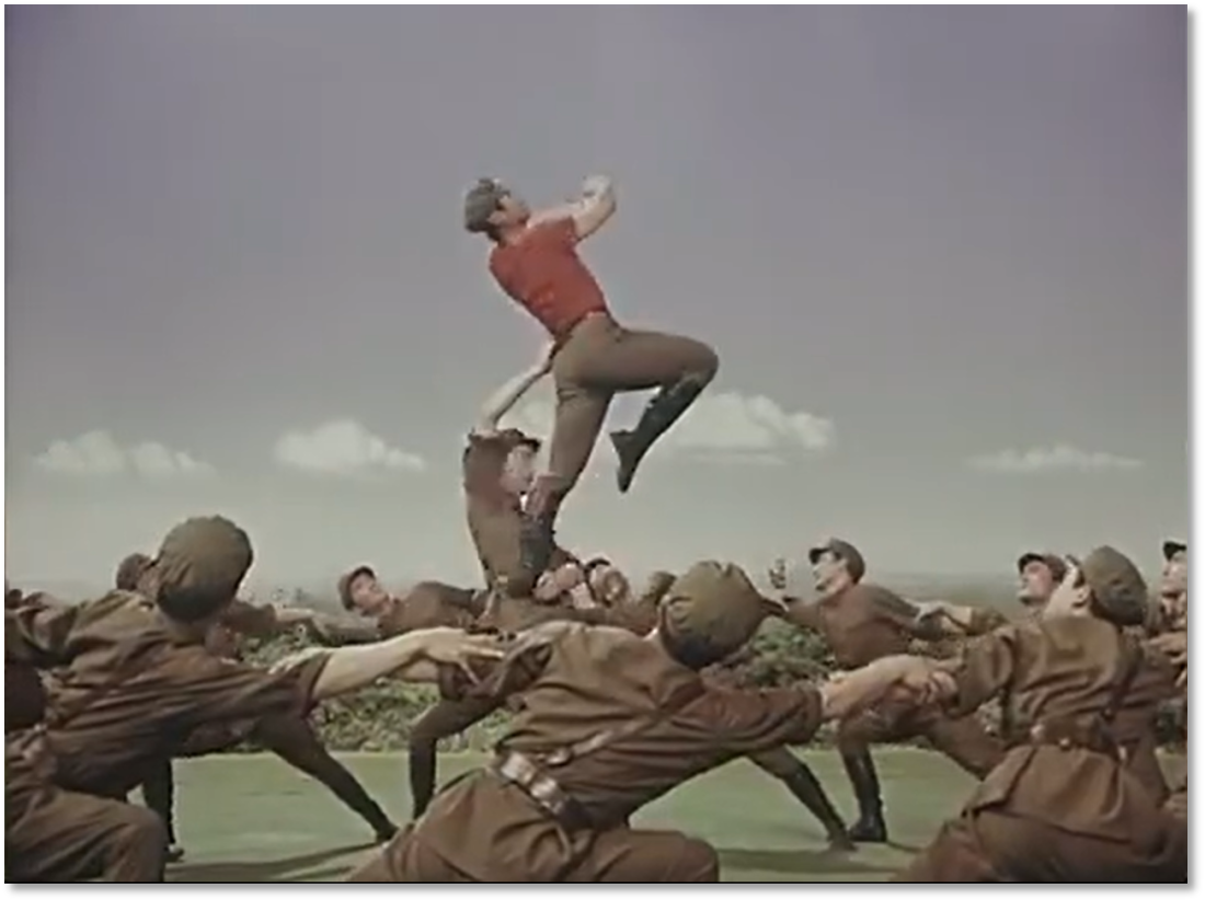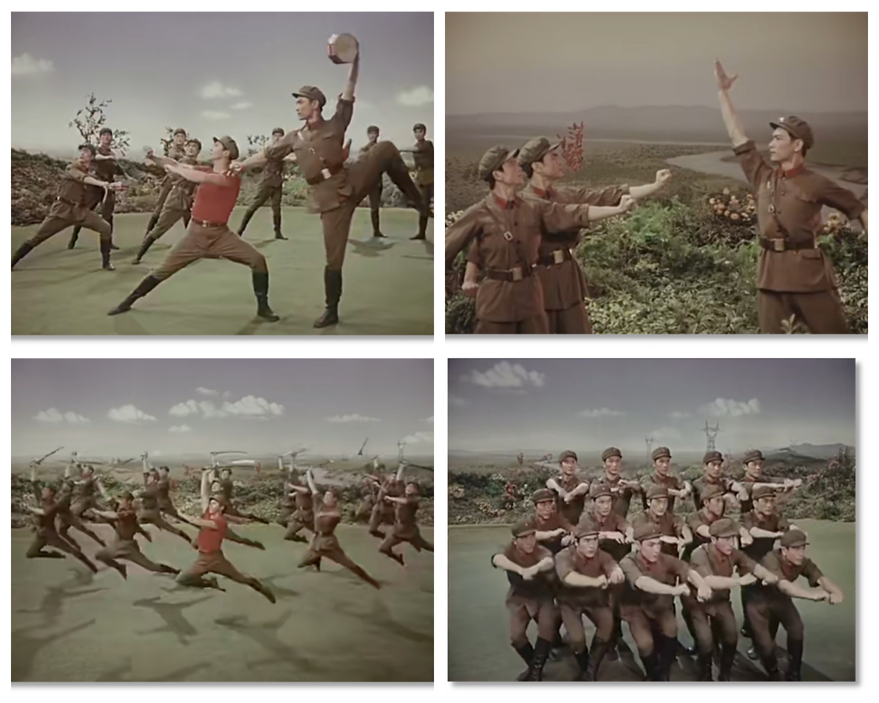 有趣的是,膠片并非被動(dòng)記錄,它悄然行使著選擇的權(quán)力——它決定了后世的人們將以何種視角、何種景別來銘記《戰(zhàn)馬嘶鳴》。在鏡頭中定格下來的膠片拷貝,就此定義了經(jīng)典的面貌。從舞臺(tái)到膠片,作品完成了一次關(guān)鍵的媒介化轉(zhuǎn)身,從一場限時(shí)演出,變身為一個(gè)時(shí)代的文化符號。這使軍藝精神在沒有數(shù)字媒體的時(shí)代,得以廣泛流傳和保存。