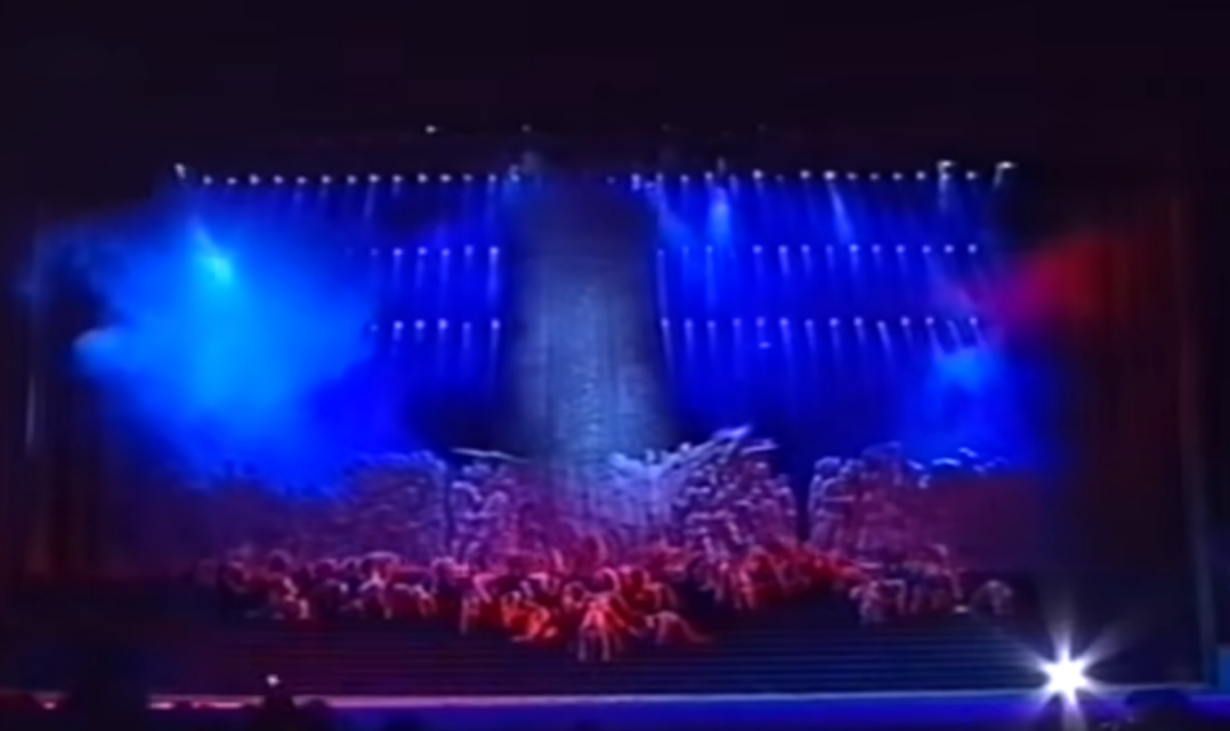 序幕以呂其明《紅旗頌》交響詩為音樂主線,卻打破了音樂會式的聽覺呈現(xiàn)模式。當(dāng)銅管樂器奏響引子部分那莊嚴(yán)而略帶悲壯的旋律時,舞臺上的紀(jì)念碑浮雕在幽藍(lán)燈光中緩緩浮現(xiàn),音樂的歷史厚重感被瞬間視覺化;當(dāng)弦樂群進(jìn)入抒情的中段,合唱團(tuán)六百人的聲浪如潮水般涌入,舞臺后方的巨幅紅綢開始緩緩涌動,音樂的柔情與激情在空間中獲得了可視化的延展;當(dāng)樂曲推向高潮,交響樂團(tuán)與合唱團(tuán)以排山倒海之勢奏響《東方紅》與《義勇軍進(jìn)行曲》的旋律變奏時,舞臺上巨幅五星紅旗冉冉升起,音樂的崇高感與視覺的震撼力在那一刻達(dá)到了完美的共振。這種音樂與視覺的精密對位,使觀眾不僅是“聽”到紅旗的頌歌,更是“看”到了紅旗的魂魄,“感”受到了歷史的脈動。