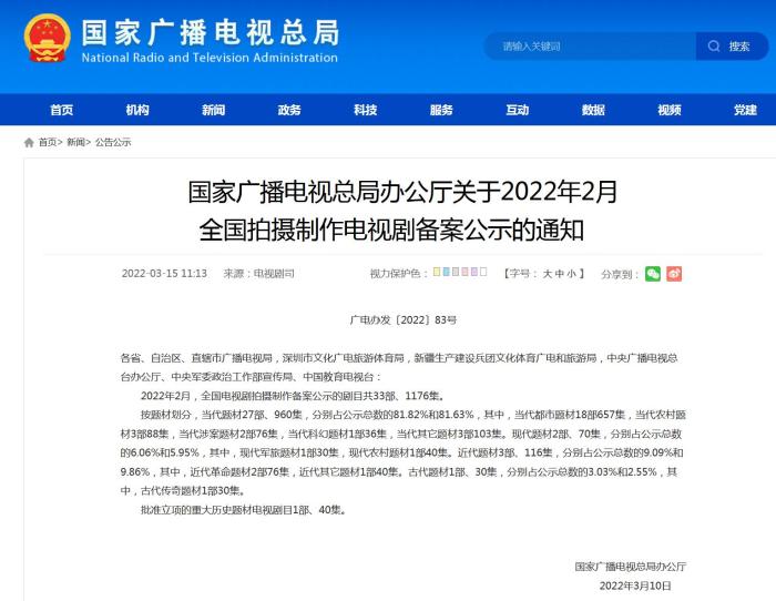 3月15日,國家廣播電視總局網(wǎng)站刊發(fā)關(guān)于2022年2月全國拍攝制作電視劇備案公示的通知(以下簡(jiǎn)稱通知)。其中顯示,2022年2月,全國電視劇拍攝制作備案公示的劇目共33部、1176集。