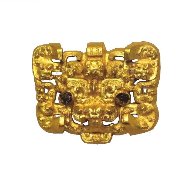 備受關(guān)注的戰(zhàn)國(guó)晚期高浮雕獸面紋金帶扣,現(xiàn)藏于甘肅省文物考古研究所。金帶扣的主體為一獸頭,采用高浮雕手法雕出;獸頭上鏤雕出龍獸相斗的圖案,并裝飾有連珠紋、卷云紋、羽狀紋等;獸頭的眼部鑲嵌藍(lán)色玻璃珠。此器物具有中原華夏與邊陲戎狄兩種藝術(shù)風(fēng)格。