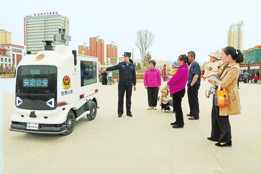 群眾參觀公安智能巡邏車。近日,定西市安定區(qū)許鐵堂廣場上出現(xiàn)一款引人注目的科技產(chǎn)品——智能巡邏車,這是安定公安在現(xiàn)代化警務(wù)建設(shè)中引入的智慧產(chǎn)品,能夠24小時(shí)不間斷工作,引發(fā)群眾關(guān)注。 新甘肅·甘肅法治報(bào)通訊員楊永剛攝