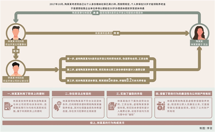 貪污罪。2017年10月,林某某妻子陶某某(無業(yè),另案處理)考慮到自己以個人身份繳納社保已滿15年,而按照規(guī)定,個人參保在55歲才能領(lǐng)取養(yǎng)老金,于是便想掛靠企業(yè)單位參保,以便能在50歲辦理退休、提前享受退休待遇?;诖耍漳衬潮闩c林某某商量能否掛靠B縣農(nóng)業(yè)開發(fā)公司提前辦理退休,林某某聽后表示同意,并利用擔任該公司董事長的職務(wù)便利,在明知陶某某不符合提前退休條件的情況下,安排時任公司辦公室主任李某某(另案處理)虛構(gòu)勞動關(guān)系,為陶某某以該公司職工身份辦理退休事宜。手續(xù)辦理過程中,李某某按林某某的安排,偽造B縣農(nóng)業(yè)開發(fā)公司與陶某某的《勞動合同書》,經(jīng)林某某本人簽字后加蓋公司合同專用章,陶某某憑該合同在B縣人力資源和社會保障局進行勞動合同鑒證。完成鑒證后,陶某某順利以B縣農(nóng)業(yè)開發(fā)公司職工身份參保,當年度公司為其繳納職工養(yǎng)老保險、工傷保險、失業(yè)保險、醫(yī)療保險共計7649.76元。其間,陶某某從未在B縣農(nóng)業(yè)開發(fā)公司上班,也未向公司補繳為其繳納的社保費用。