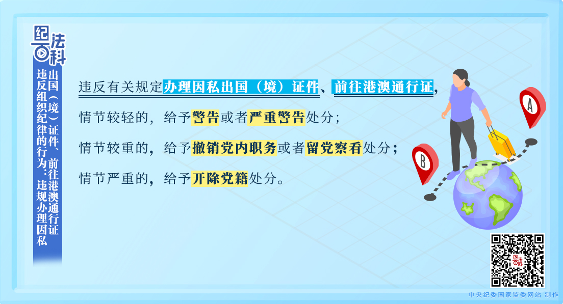 《中國(guó)共產(chǎn)黨紀(jì)律處分條例》第九十一條規(guī)定:“違反有關(guān)規(guī)定辦理因私出國(guó)(境)證件、前往港澳通行證,或者未經(jīng)批準(zhǔn)出入國(guó)(邊)境,情節(jié)較輕的,給予警告或者嚴(yán)重警告處分;情節(jié)較重的,給予撤銷(xiāo)黨內(nèi)職務(wù)或者留黨察看處分;情節(jié)嚴(yán)重的,給予開(kāi)除黨籍處分。”