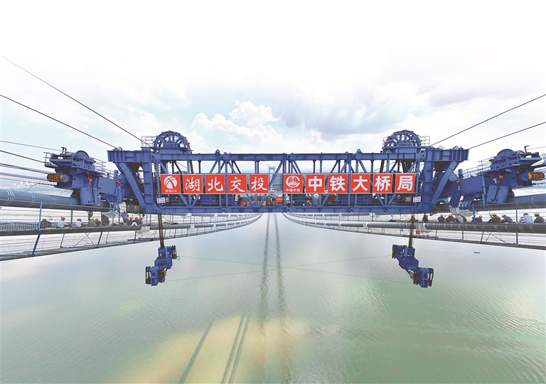 那就自己創(chuàng)造經驗!湖北交投牽頭聯合承建單位,在大橋建設前期進行了大量數據論證和可行性試驗,一次次研究優(yōu)化施工方案。他們堅持設備優(yōu)化與工藝創(chuàng)新“雙管齊下”,應用纜載吊機、液壓提升裝置等裝備創(chuàng)新施工方法,順利攻克了難關。