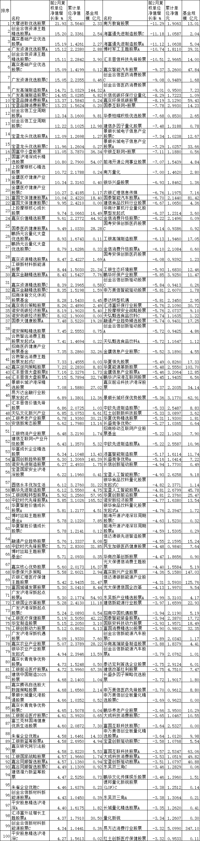 跌幅榜上,前2月跌幅超過10%的普通股票型基金僅有5只,跌幅超過5%的共有54只。跌幅靠前的基金大多重倉新能源、科技等行業(yè)個股,近期該類個股回調(diào)幅度較大,導(dǎo)致重倉基金業(yè)績回撤明顯。