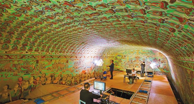 莫高窟第148窟數(shù)字化采集工作現(xiàn)場。敦煌研究院在國內率先進行文物數(shù)字化的探索研究,形成了一套科學的壁畫彩塑數(shù)字化技術,制定了14項文物數(shù)字化保護技術標準與規(guī)范。