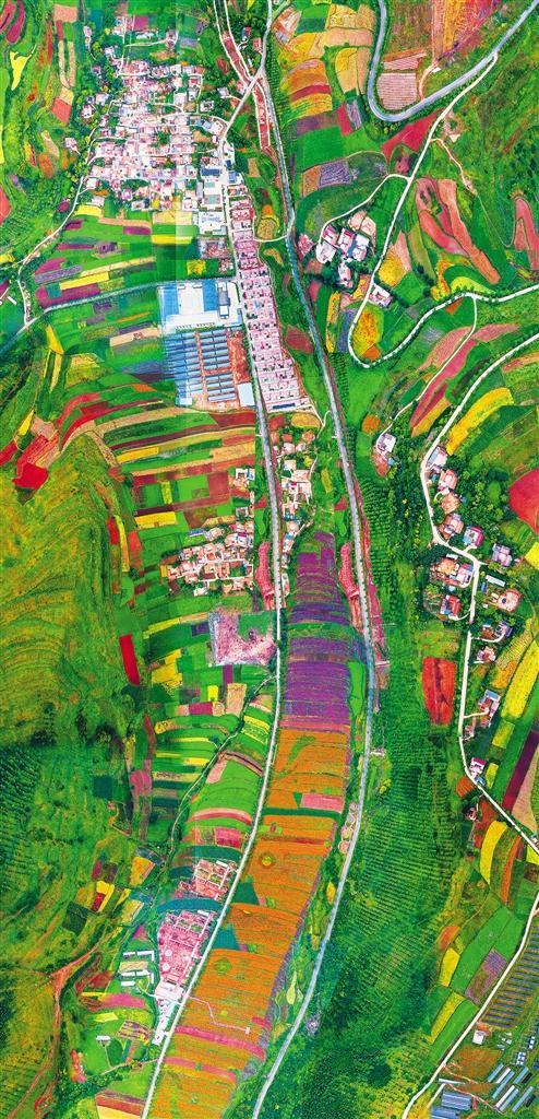 俯瞰渭源縣田家河鄉(xiāng)元古堆村新貌。元古堆村通過發(fā)展農(nóng)產(chǎn)品加工、鄉(xiāng)村旅游、電子商務、光伏發(fā)電等產(chǎn)業(yè)實現(xiàn)脫貧摘帽,日子越過越紅火。王 濤攝(中經(jīng)視覺)