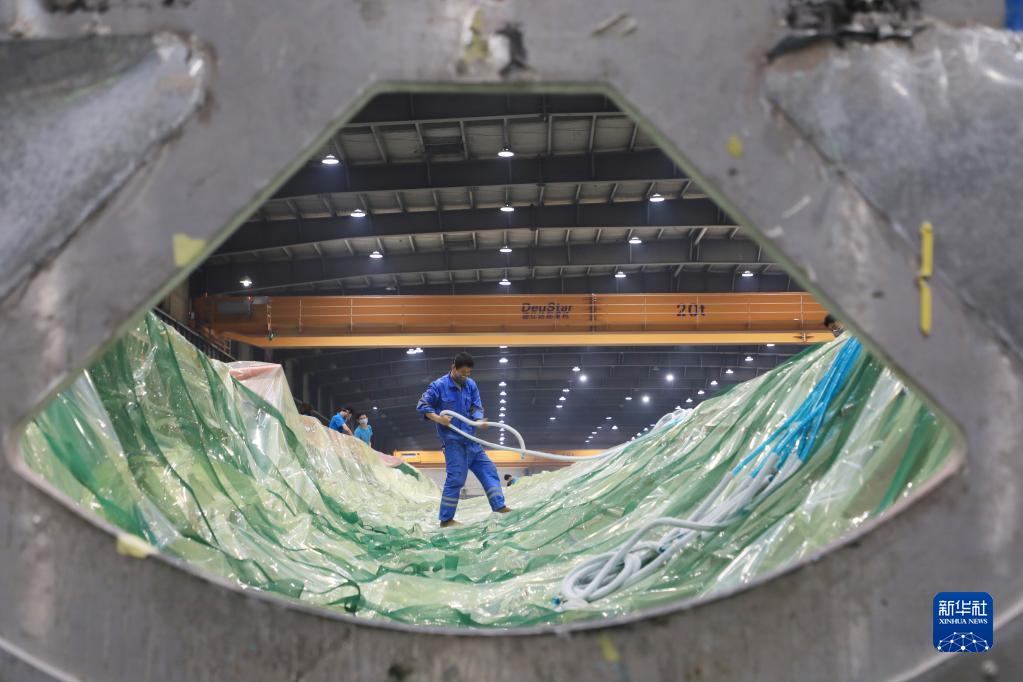 2月17日,在酒泉經(jīng)濟技術開發(fā)區(qū)的一家風電葉片制造企業(yè),工人在風機葉片生產(chǎn)線為葉片灌注做準備。