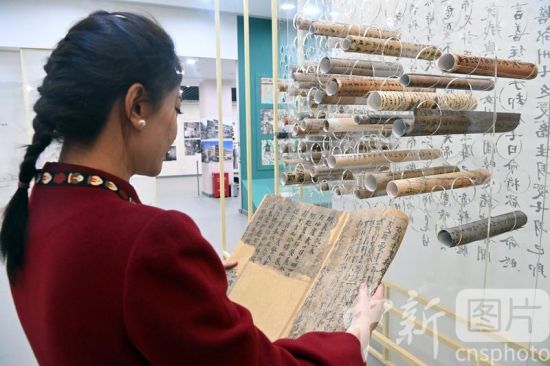 3月14日,敦煌研究院敦煌文獻(xiàn)研究所所長趙曉星接受中新社記者專訪介紹稱,全彩印《敦煌文獻(xiàn)全集》出版工作已正式啟動(dòng),該叢書采用全彩印的方式刊布敦煌文獻(xiàn),實(shí)現(xiàn)敦煌文獻(xiàn)在線下圖錄中的高清還原。敦煌文獻(xiàn),又稱敦煌遺書,是指1900年在甘肅敦煌莫高窟藏經(jīng)洞發(fā)現(xiàn)的公元4世紀(jì)至11世紀(jì)的寫本、印本和拓片等文獻(xiàn)。據(jù)最新統(tǒng)計(jì)顯示,其總數(shù)近7萬件。目前這些文獻(xiàn)分藏于中、英、法、俄、日等國的數(shù)十家收藏機(jī)構(gòu),一直缺乏完整的聯(lián)合目錄。圖為3月3日,工作人員在敦煌藝術(shù)館卷軸墻前閱覽敦煌遺書影印品。 中新社記者 九美旦增 攝
