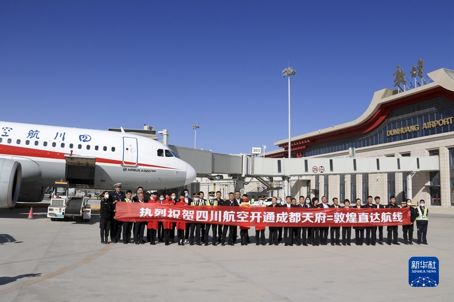 3月26日,由四川航空公司執(zhí)飛的成都至敦煌往返直達(dá)航線正式通航。這是首航航班機組人員與機場工作人員在甘肅敦煌莫高國際機場合影。新華社發(fā)(張曉亮攝)
