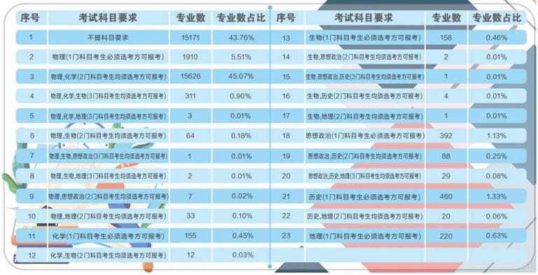 據(jù)了解,根據(jù)《甘肅省深化高等學(xué)??荚囌猩C合改革實施方案》要求,從 2021年秋季入學(xué)的普通高中一年級學(xué)生開始,實行基于統(tǒng)一高考和高中學(xué)業(yè)水平考試成績、參考綜合素質(zhì)評價的高??荚囌猩J?。到2024年,基本形成分類考試、綜合評價、多元錄取的高??荚囌猩贫?,健全促進公平、科學(xué)選才、監(jiān)督有力的高校考試招生體制機制。此次在我省報送選考科目要求的高校專業(yè)共計64092條,其中本科專業(yè)34670條。專業(yè)選考科目要求共有23種組合,其中不提科目要求的本科專業(yè)數(shù)量占本科專業(yè)總數(shù)的43.76%,含物理科目的占比為51.79%,含化學(xué)科目的占比為46.46%,含歷史科目的占比為1.74%,含“物理+化學(xué)”科目的占比為45.98%。