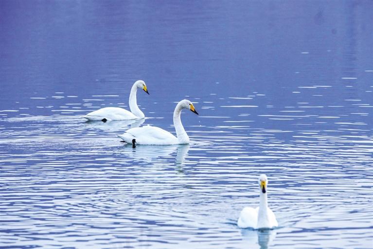 “生態(tài)好不好,鳥兒是晴雨表。”近日,西固區(qū)達川鎮(zhèn)三河口迎來了今年首批越冬大天鵝,吸引了眾多市民游客前往觀賞。記者從蘭州市林業(yè)局了解到,目前黃河蘭州段濕地分布和棲息的濕地鳥類約有68種,其中,國家I級重點保護鳥類3種(黑嘴鷗、黑鸛、白尾海雕),國家II級保護鳥類5種(大天鵝、鴛鴦、鹮嘴鷸、白腰杓鷸、鶚)。鵲鴨、綠頭鴨、斑嘴鴨、普通秋沙鴨和漁鷗等優(yōu)勢越冬水鳥種群數(shù)量較大,主要棲息地分布在沿線各灘涂地,棲息地質(zhì)量較高。