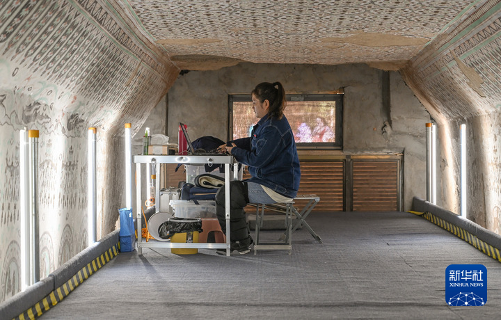 8月3日,在敦煌莫高窟正在保護修繕的第55窟內(nèi),一位文保工作者對采集的數(shù)據(jù)進行整理。新華每日電訊記者 李賀 攝