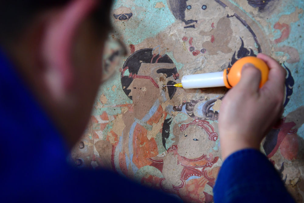 工作人員在修復(fù)出現(xiàn)病害的壁畫。記者 杜哲宇 攝
