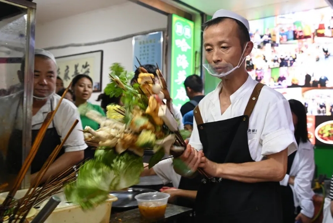 工作人員在天水市名優(yōu)小吃城內(nèi)制作麻辣燙。新華社記者呂帥攝