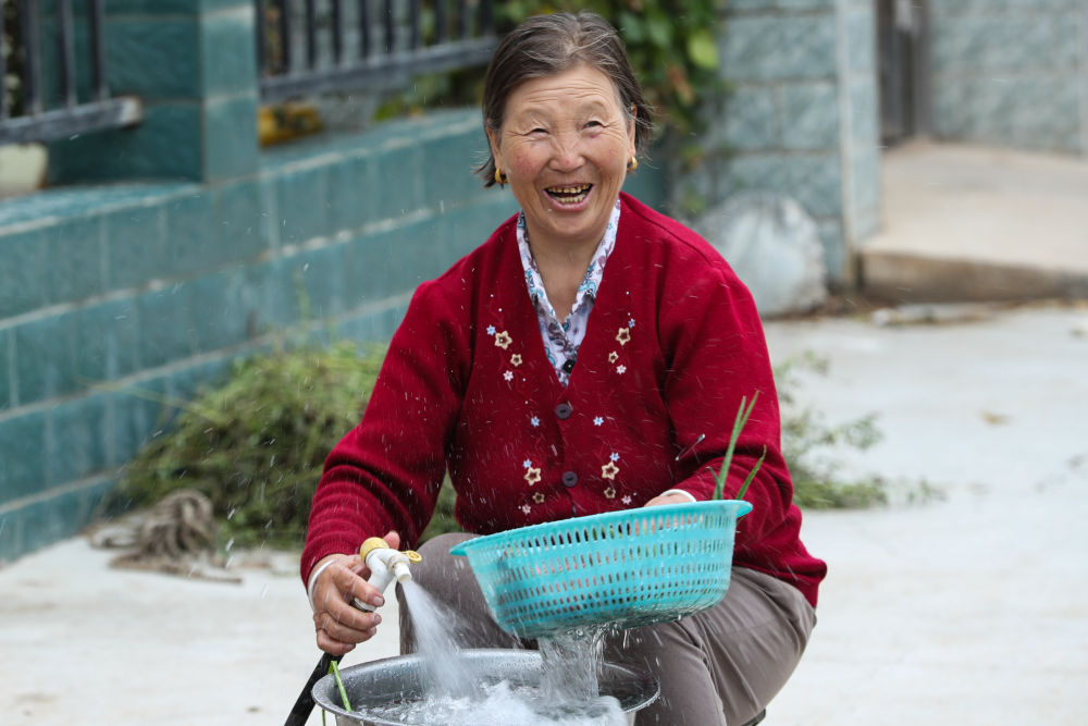 近日,在定西市隴西縣雙泉鎮(zhèn)癿羊口村,68歲的村民何淑蘭用引洮工程引來(lái)的自來(lái)水洗菜。新華社記者郎兵兵攝