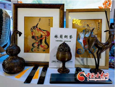 在甘肅館內(nèi)的林蘭銅藝展區(qū),白銀林蘭銅藝文化發(fā)展有限公司負責(zé)人馬艷萍一邊向觀展賓客介紹自己的產(chǎn)品,一邊向大家推介自己的家鄉(xiāng)—甘肅省白銀市。