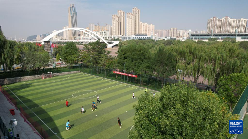 市民在位于黃河蘭州段南岸的體育公園足球場內(nèi)踢球(9月24日攝,無人機(jī)照片)。新華社記者陳斌攝