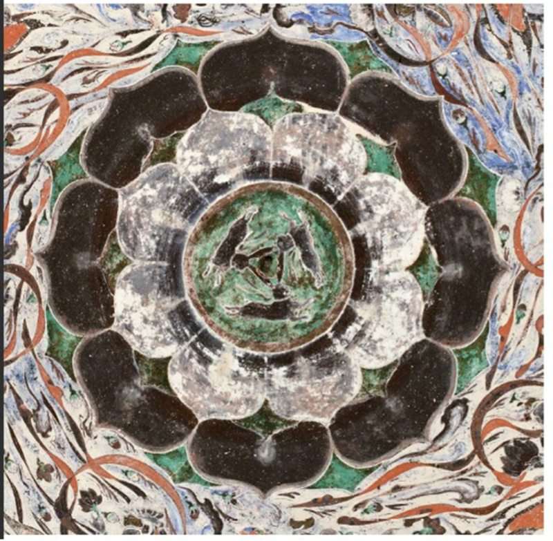 踏入窟內(nèi),仰頭凝望,藻井中央那朵八瓣蓮花宛如夜空中綻放的星辰,花瓣層層疊疊,細(xì)膩而生動。蓮花中央,是獨具匠心的三兔連耳圖案。