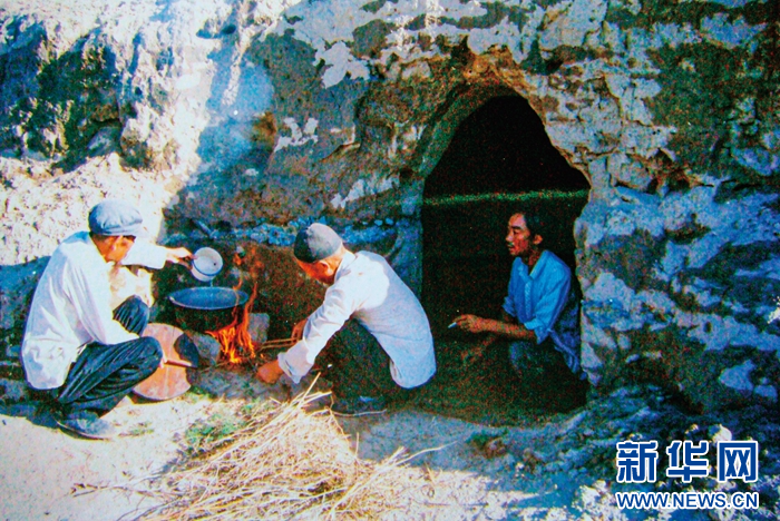 1983年,“六老漢”第一代治沙人在“地窩子”生火做飯(資料圖片)。(八步沙林場(chǎng)供圖)