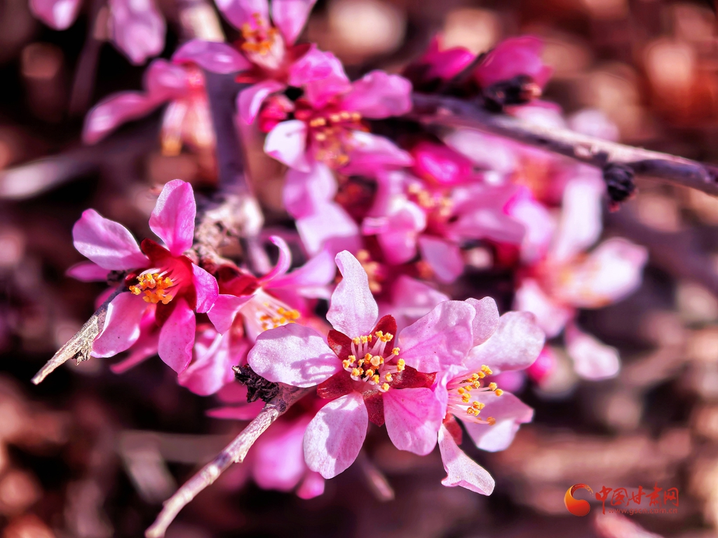 光禿禿的枝條上,不見半片新葉,只有一簇簇、一團(tuán)團(tuán)粉紅色的小花,密密匝匝地綴滿枝頭,擠擠挨挨,溫暖又熱烈。遠(yuǎn)遠(yuǎn)望去,像一縷輕盈的粉紅色云煙,輕輕飄落在蒼黃的山坡上,為沉寂的祁連山添上一抹難得的溫柔亮色;走近細(xì)看,花瓣薄如蟬翼,質(zhì)地輕盈細(xì)膩,嫩黃的花蕊纖細(xì)挺立,在寒風(fēng)中微微顫動(dòng),看似柔弱的外表下,藏著不屈的傲骨。偶爾一場(chǎng)春雪突襲,潔白的雪花壓彎枝頭,花朵看似垂落不堪,可待到雪化風(fēng)輕,它便立刻挺直腰肢,重新舒展花瓣。夜里寒霜凍得花瓣晶瑩透明,仿佛一碰就碎,可朝陽升起,寒冰慢慢消融,花朵依舊盛放如初,不曾輕易凋零半分。