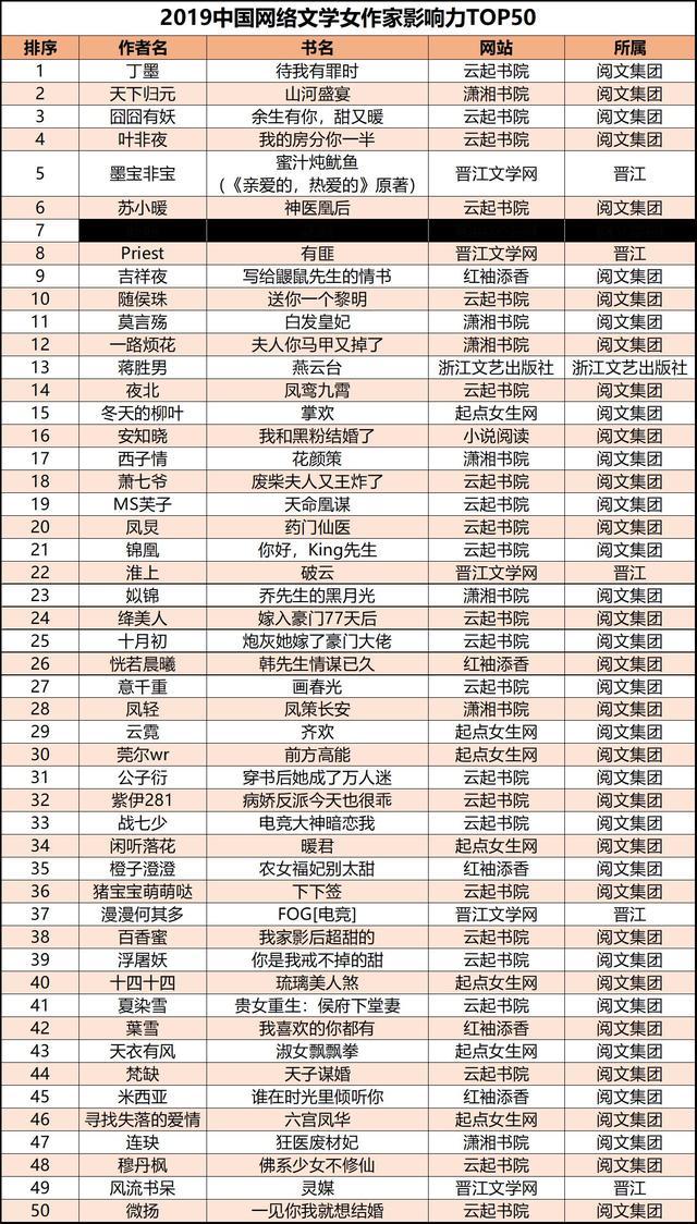 中國青年報(bào)客戶端訊(中青報(bào)·中青網(wǎng)記者 沈杰群)日前,《2019年中國網(wǎng)絡(luò)作家影響力榜》正式發(fā)布,通過對(duì)作家的作品影響力、平臺(tái)影響力及新媒體影響力多維度的分析與論證,綜合衡量出作家影響力,評(píng)選出國內(nèi)最具影響力男作家TOP50及女作家TOP50。
