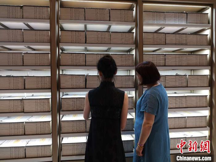 中新網(wǎng)杭州6月18日電(童笑雨) 古色古香的木質(zhì)外包,干凈整潔的手工印刷,6月18日,線裝全套文淵閣《四庫全書》在浙江杭州展出。據(jù)相關負責人介紹,該套叢書將對民眾免費開放,各界人士均可來“西湖會客廳”閱讀、研究。