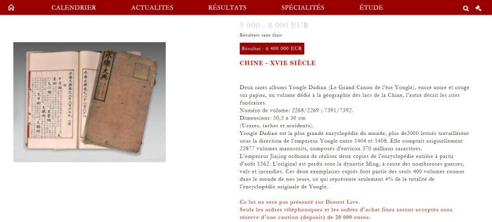 當(dāng)?shù)貢r(shí)間7月7日,兩冊(cè)《永樂(lè)大典》在法國(guó)巴黎一家拍賣行拍賣。