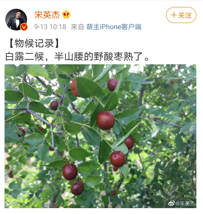如今,他仍然會隨手在社交媒體上記錄四時風(fēng)物的變化,前幾天發(fā)了一張照片,配文“白露二候,半山腰的野酸棗熟了。”對他而言,隨時關(guān)注氣候與物候,已經(jīng)成為一種習(xí)慣。(完)