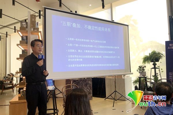 《智能經濟》新書研討會上,張曉峰在進行主題演講。中國青年網(wǎng)記者 張詩瑩 攝