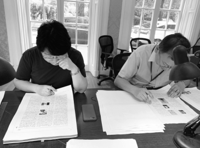 上海辭書出版社社長(zhǎng)秦志華(右)和副總編輯張敏審讀《辭?!罚ǖ谄甙妫┬?。