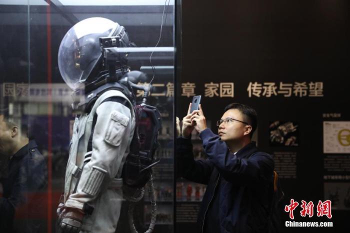 資料圖:展出的電影《流浪地球》中的服裝道具“地表防護服”吸引觀眾。中新社記者 蔣啟明 攝
