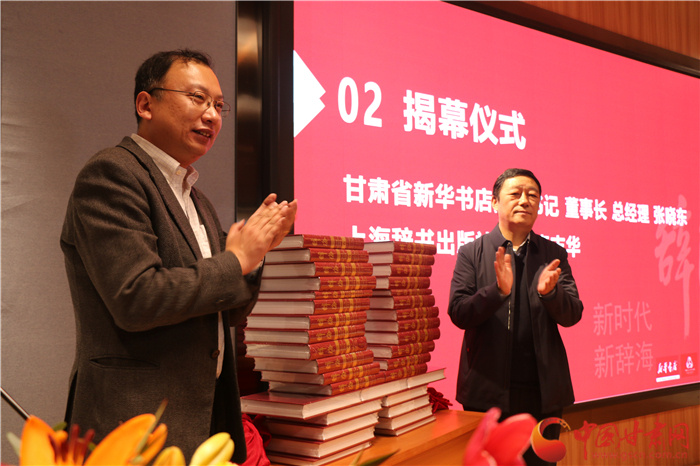 甘肅省新華書店黨委書記、董事長、總經(jīng)理張曉東(右)與上海辭書出版社社長秦志華(左)共同為首發(fā)式揭幕。