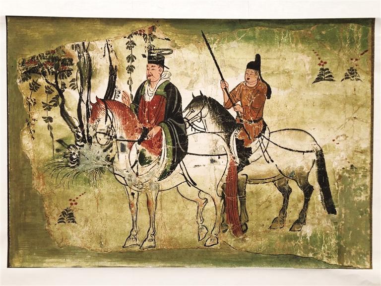 《兩位騎馬人》圖是大唐作品,現(xiàn)藏于法國吉美博物館。畫面上前面一匹紅鬃馬背上騎著一位男士,他身穿黑紅兩色長枹,佩冠。后面黑鬃馬上的男士好像是仆人,雙手持杖,戴冠穿長衫。畫面上人馬造型比例準確到位,用筆自然流暢,駿馬強壯有力,人物體魄強悍。
