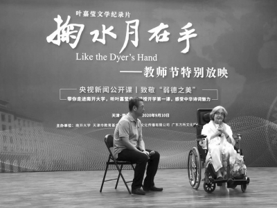 九月十日教師節(jié),南開大學(xué)舉辦《掬水月在手》影片首映式。葉嘉瑩先生是國際儒聯(lián)榮譽(yù)顧問,我銜命陪同王念寧副會(huì)長專程赴南開致賀,有幸在南開禮堂聆聽九十六歲高齡的迦陵先生與白巖松共話詩意人生。迦陵先生坐在輪椅上娓娓道來,鬢發(fā)皤然,聲如洪鐘,風(fēng)華絕代。