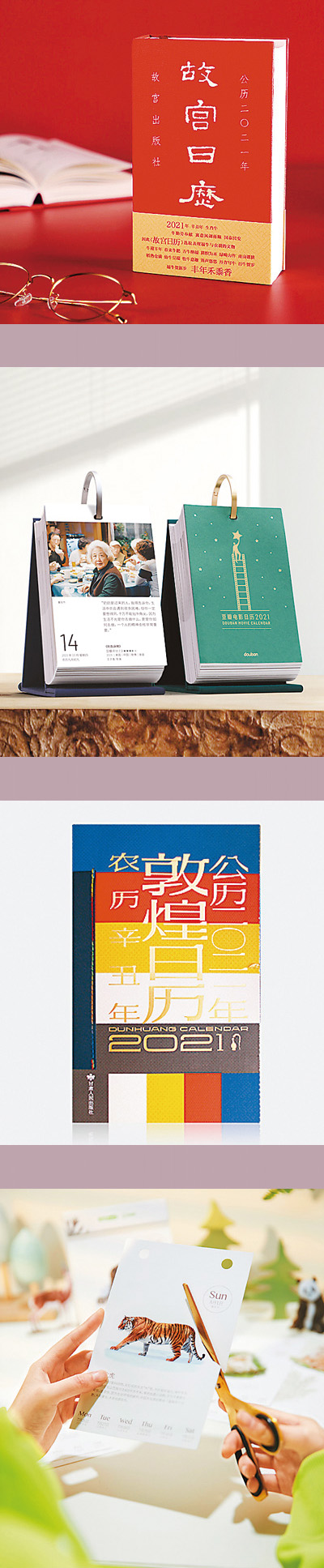 圖片依次為:2021年《故宮日歷》《豆瓣電影日歷》《敦煌日歷》《物種日歷》