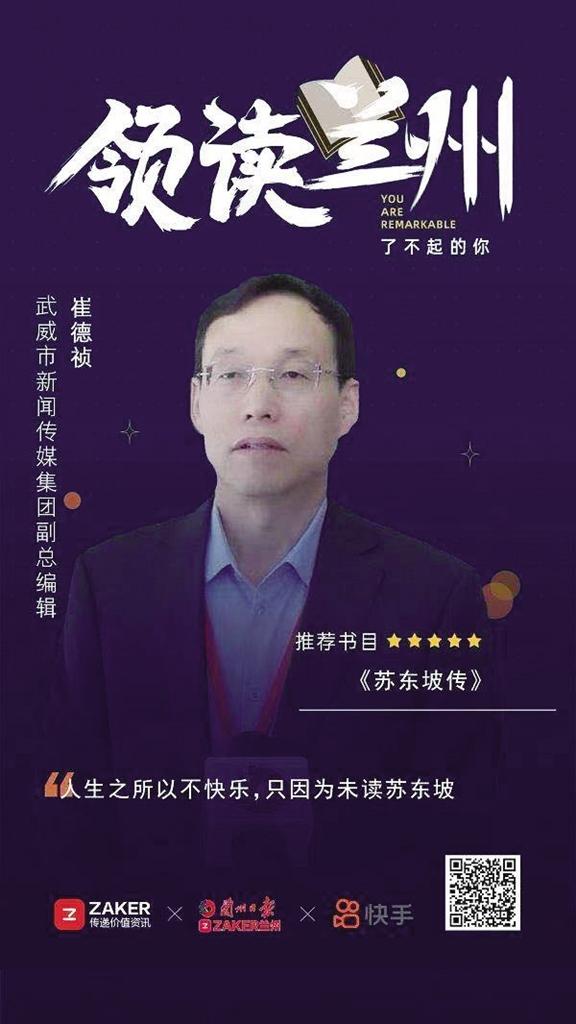 “領(lǐng)讀蘭州·了不起的你”大使薦讀進(jìn)行時(shí)……今天的薦讀大使是武威市新聞傳媒集團(tuán)副總編輯崔德禎,他最近正在讀的書(shū)是林語(yǔ)堂先生的《蘇東坡傳》,他向大家推薦這本書(shū),希望跟大家一起閱讀!