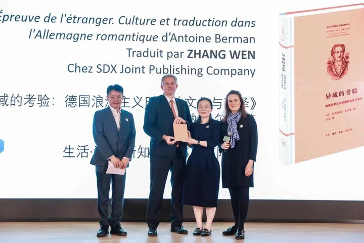 法國(guó)駐華大使羅梁(左二)為社科類獲獎(jiǎng)譯者頒獎(jiǎng)。法國(guó)駐上??傤I(lǐng)事館供圖