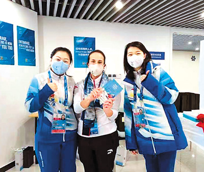 來(lái)自北京語(yǔ)言大學(xué)的志愿者向國(guó)際奧委會(huì)官員(中)贈(zèng)送《冬奧會(huì)交際漢語(yǔ)口袋書(shū)》。