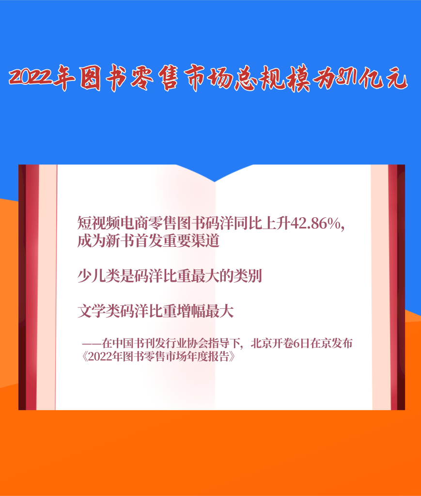 1月6日,在中國書刊發(fā)行業(yè)協(xié)會指導下,北京開卷信息技術(shù)有限公司在京發(fā)布《2022年圖書零售市場年度報告》。報告顯示,2022年我國圖書零售市場碼洋規(guī)模為871億元。短視頻電商零售圖書碼洋同比上升42.86%,碼洋占比趕超實體書店,成為新書首發(fā)重要渠道。