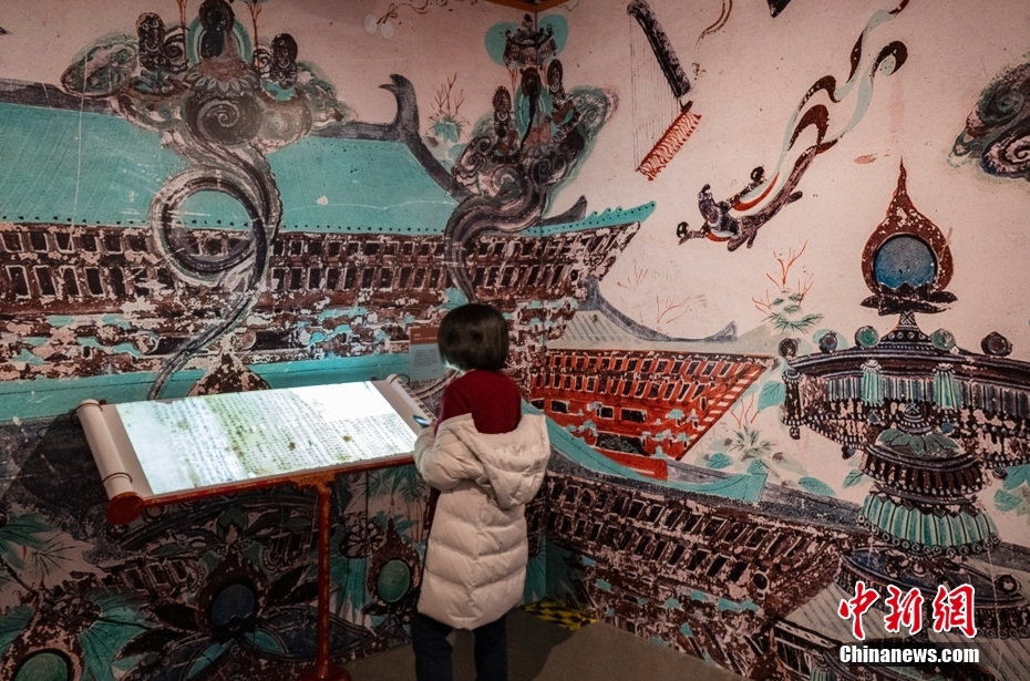圖為觀眾在“敦煌遺書”展區(qū)內(nèi)的沉浸式體驗區(qū)參觀。 中新社記者 侯宇 攝
