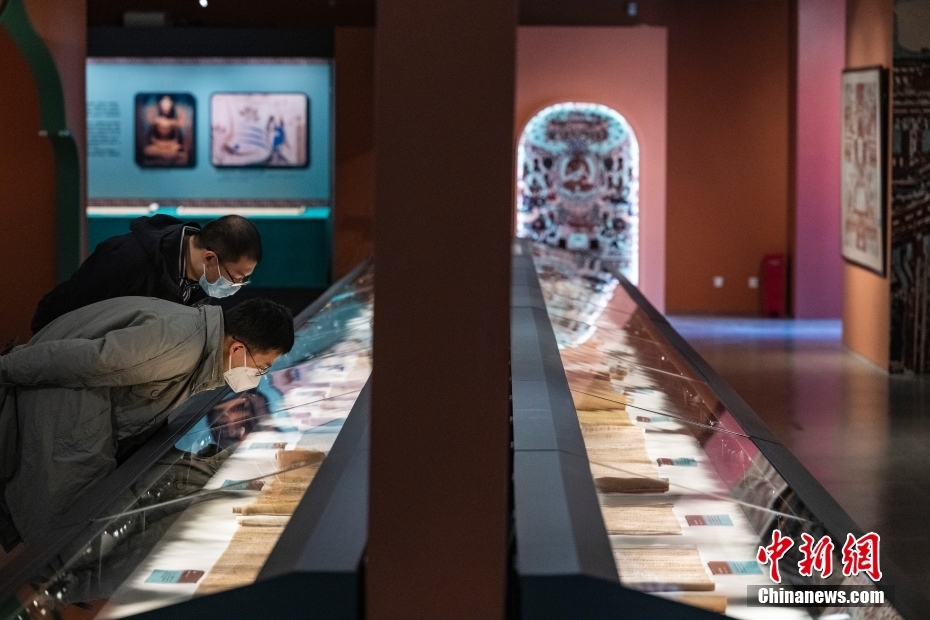 圖為“敦煌遺書”展區(qū)內(nèi)的經(jīng)文抄本展品吸引觀眾仔細查看。 中新社記者 侯宇 攝