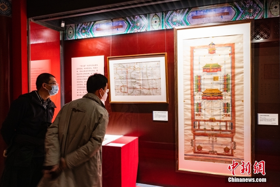 圖為“明清檔案”展區(qū)內(nèi)展示的“樣式雷”《大高殿內(nèi)坍塌修補圖樣》(右)等展品吸引觀眾查看。 中新社記者 侯宇 攝