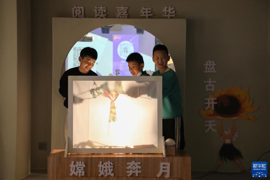 4月1日,在甘肅省蘭州市的讀者出版集團數(shù)字閱讀中心讀者小站,小朋友體驗中國神話故事主題皮影戲。新華社記者 馬希平 攝