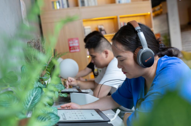 5月16日,在南昌市孺子書房·東湖意庫館,讀者利用聽書機(jī)體驗(yàn)在線閱讀。