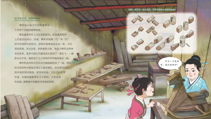 書(shū)中提到了在墻面削個(gè)角、弄個(gè)彎,“拐彎抹角”、方便大家行走的謙讓智慧;齊心協(xié)力,共同出資出力蓋房子的和諧智慧;技術(shù)和藝術(shù)并存,用榫卯聯(lián)結(jié)構(gòu)件的建構(gòu)智慧;防患于未然,保證人們生命、生活安全的防患智慧……